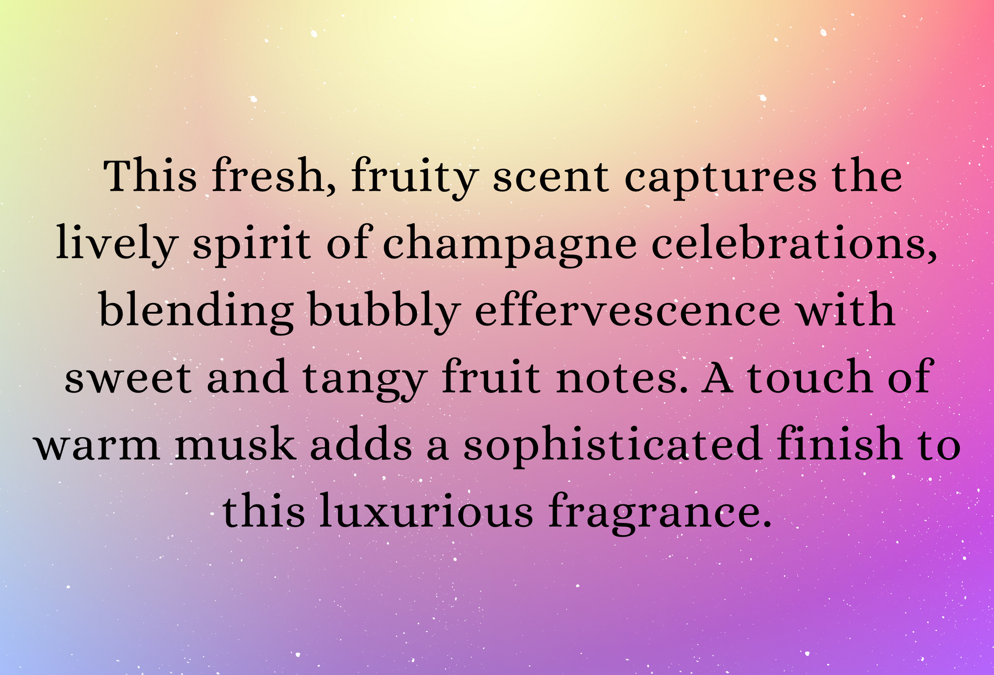 This fresh, fruity scent captures the lively spirit of champagne celebrations, blending bubbly effervescence with sweet and tangy fruit notes. A touch of warm musk adds a sophisticated finish to this luxurious fragrance.