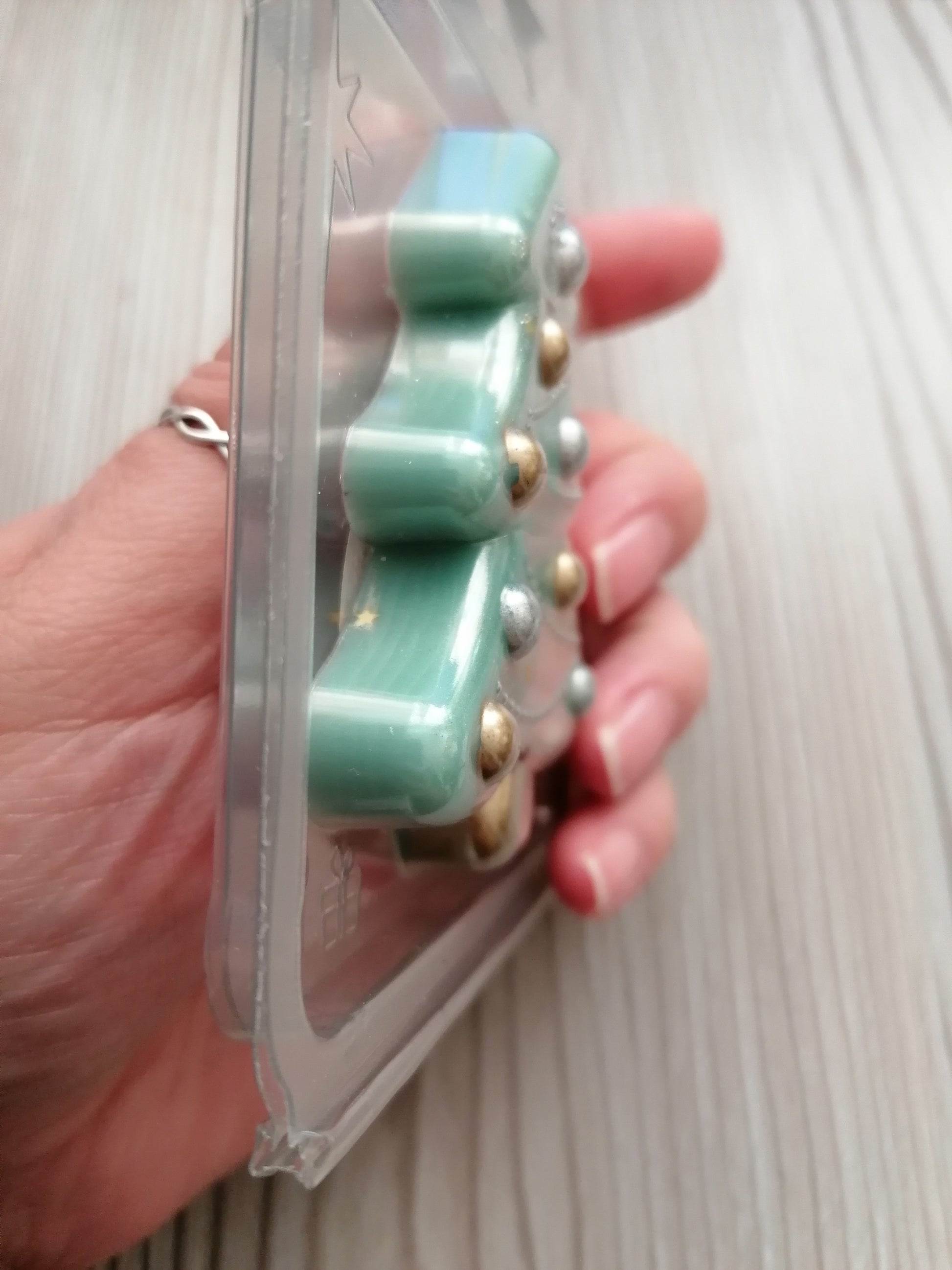 Christmas tree-shaped, Christmas scented soy wax melt snap bar. Comes in a cute gift box so a perfect little stocking filler.