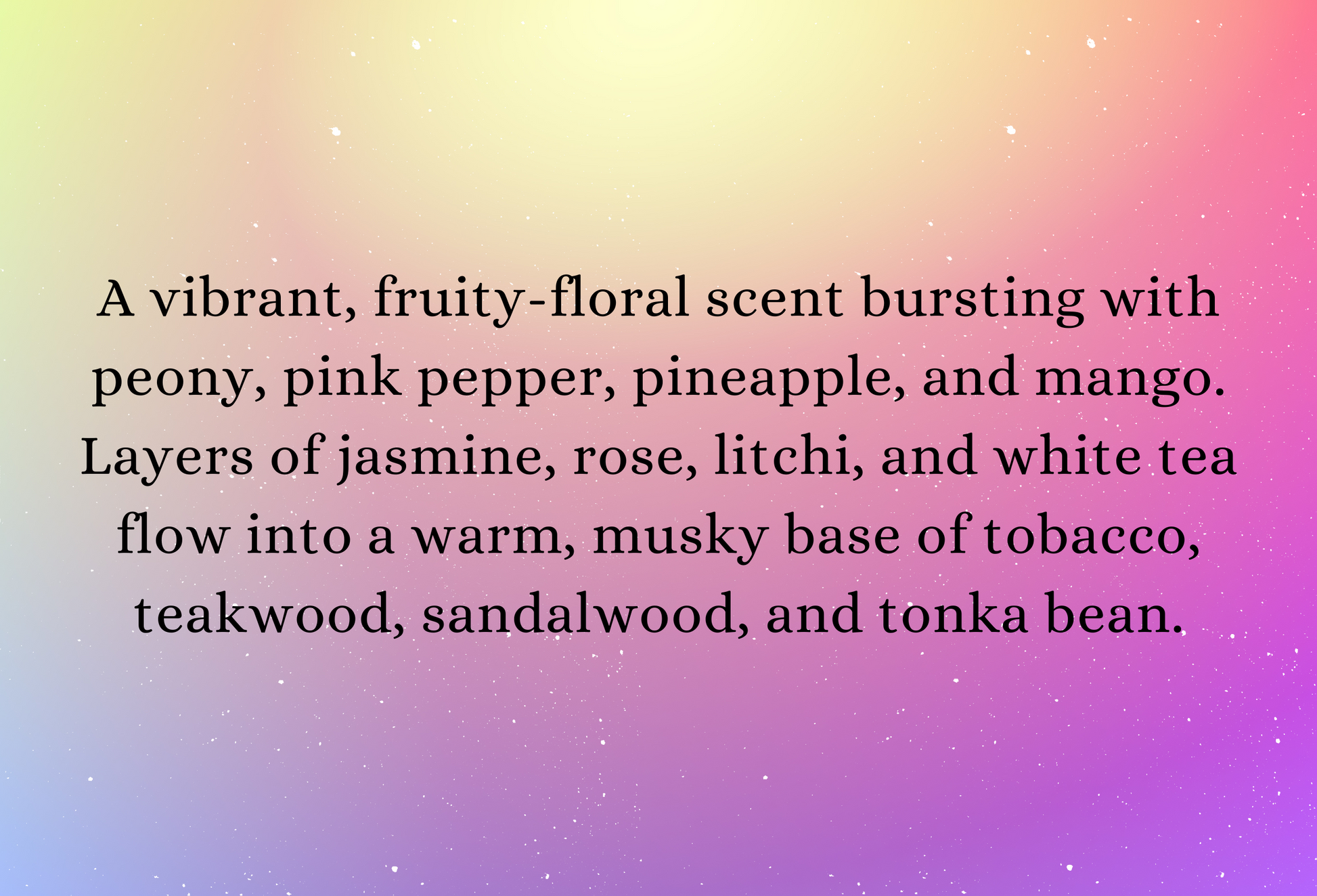 A vibrant, fruity-floral scent bursting with peony, pink pepper, pineapple, and mango. Layers of jasmine, rose, litchi, and white tea flow into a warm, musky base of tobacco, teakwood, sandalwood, and tonka bean.