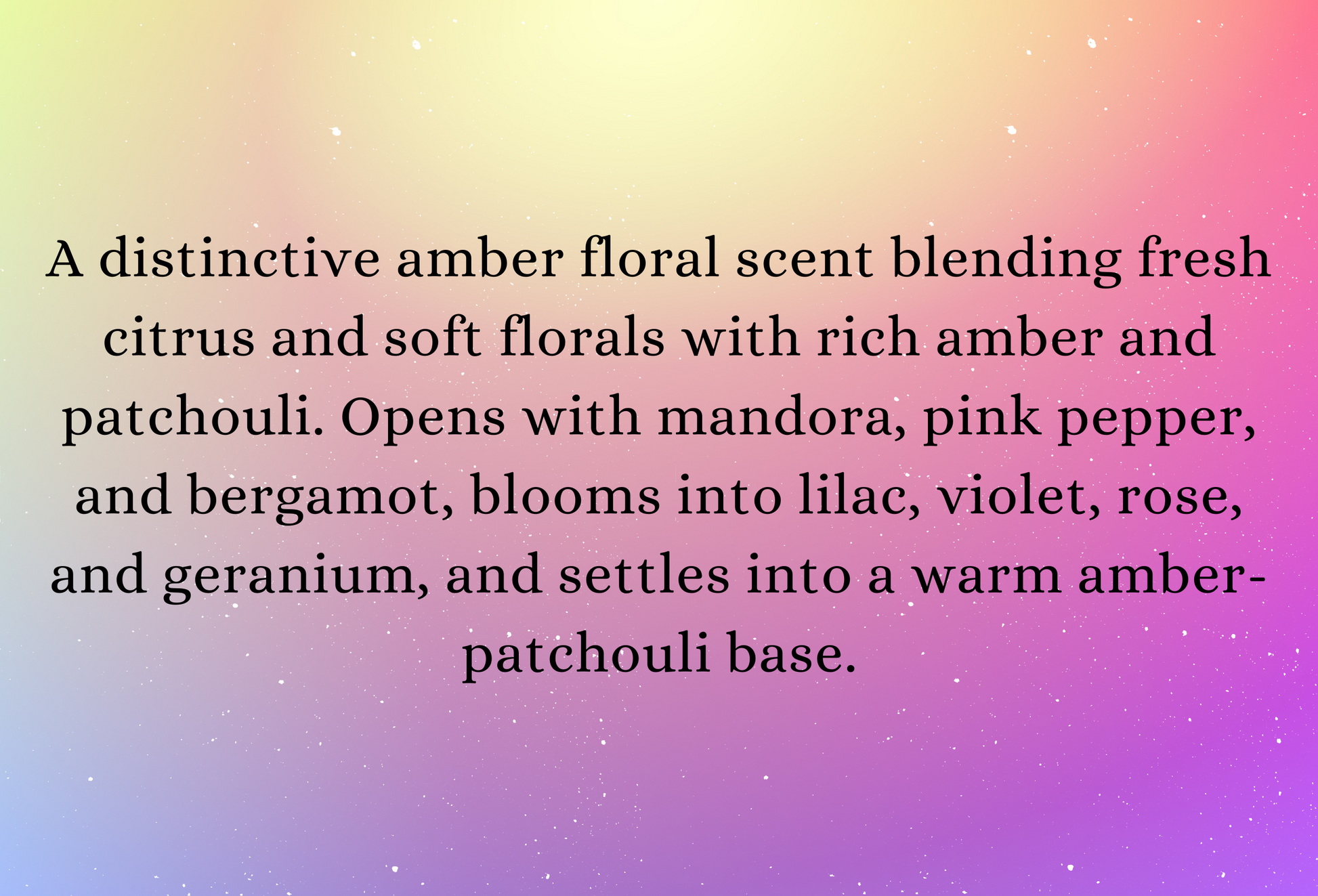 A distinctive amber floral scent blending fresh citrus and soft florals with rich amber and patchouli. Opens with mandora, pink pepper, and bergamot, blooms into lilac, violet, rose, and geranium, and settles into a warm amber-patchouli base