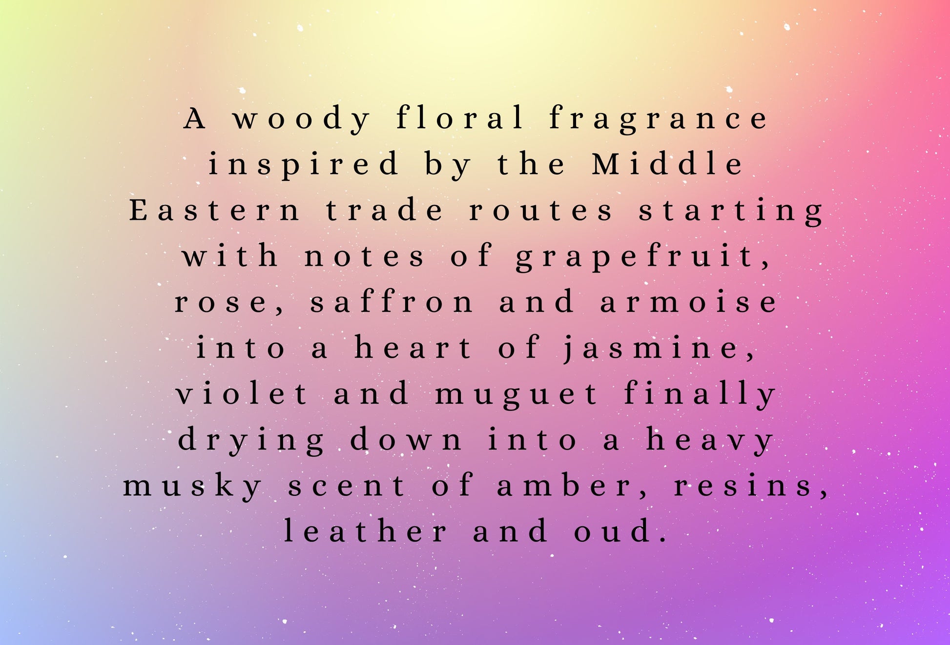 A woody floral fragrance inspired by the Middle Eastern trade routes starting with notes of grapefruit, rose, saffron and armoise into a heart of jasmine, violet and muguet finally drying down into a heavy musky scent of amber, resins, leather and oud.