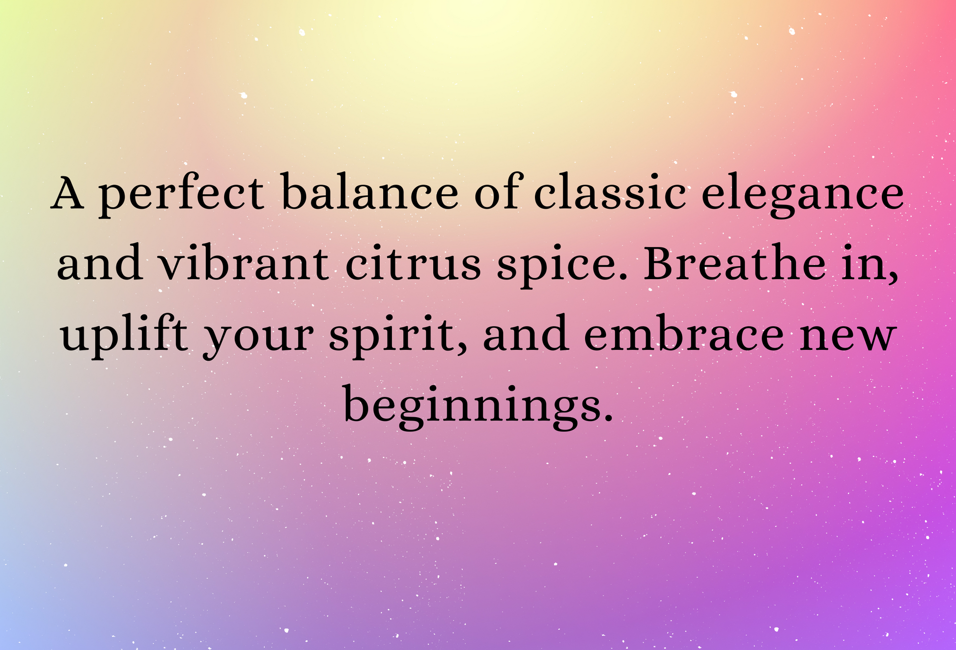 A perfect balance of classic elegance and vibrant citrus spice. Breathe in, uplift your spirit, and embrace new beginnings.