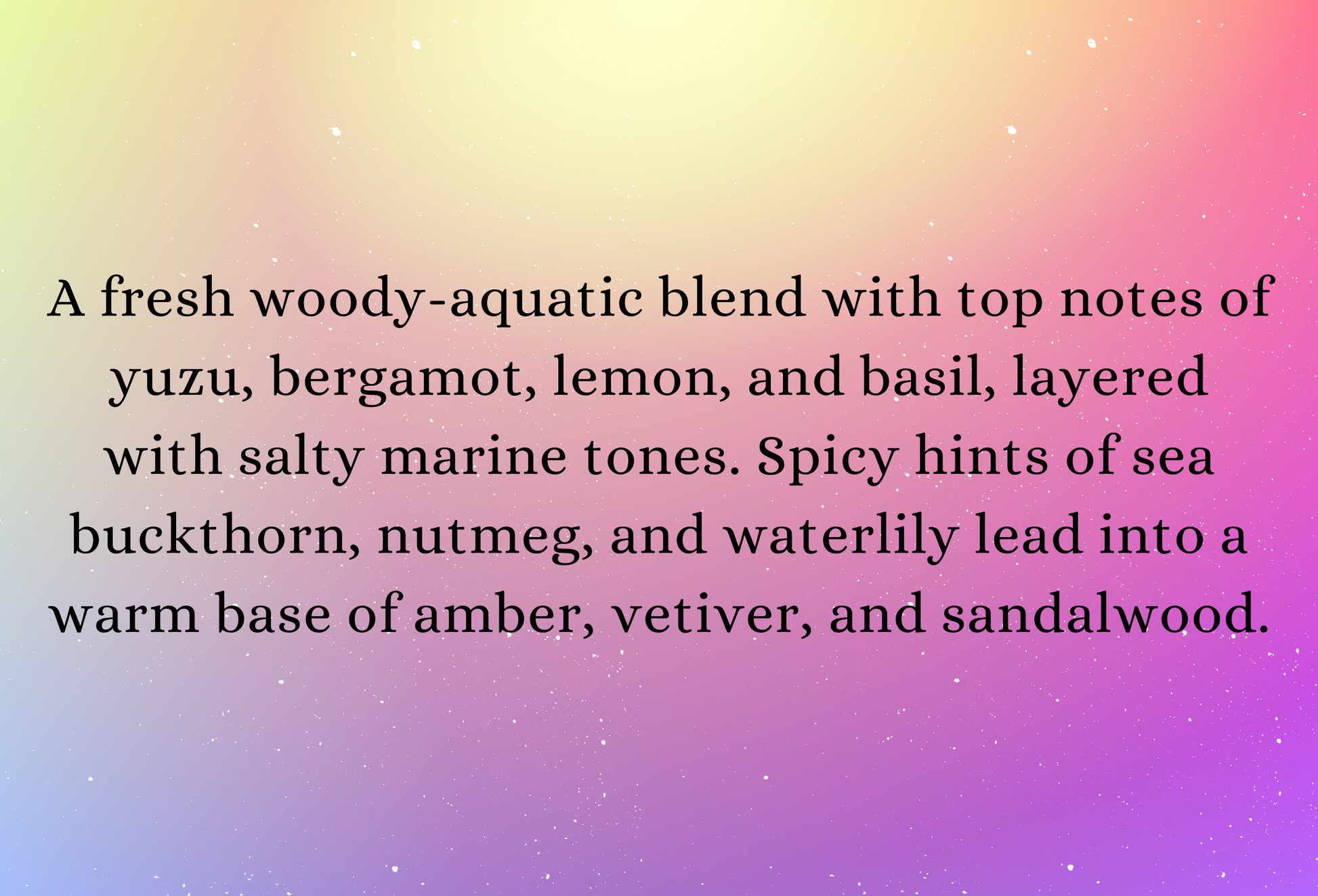 A fresh woody-aquatic blend with top notes of yuzu, bergamot, lemon, and basil, layered with salty marine tones. Spicy hints of sea buckthorn, nutmeg, and waterlily lead into a warm base of amber, vetiver, and sandalwood.