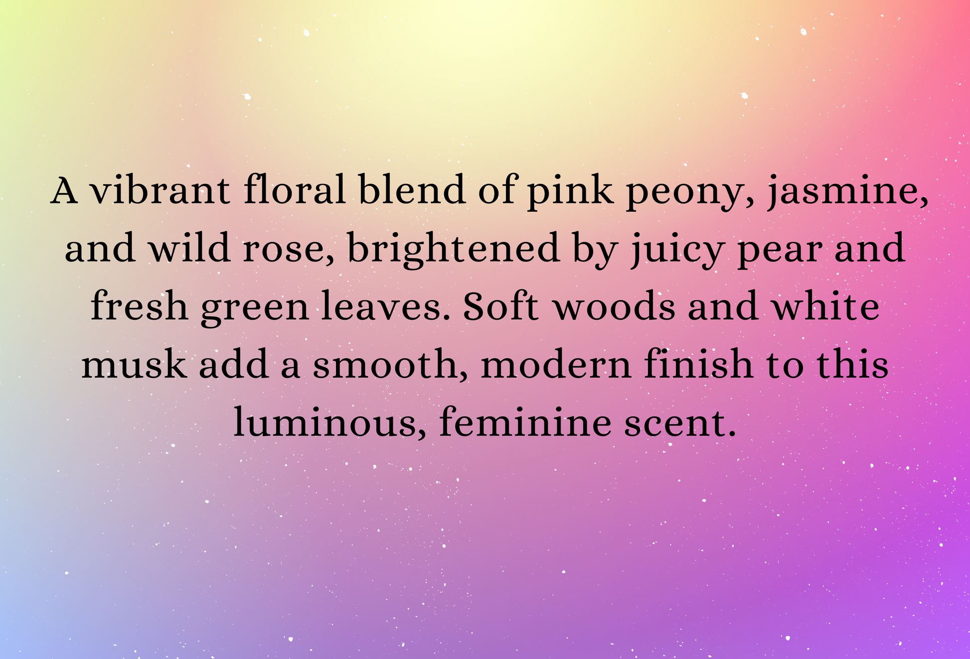 A vibrant floral blend of pink peony, jasmine, and wild rose, brightened by juicy pear and fresh green leaves. Soft woods and white musk add a smooth, modern finish to this luminous, feminine scent.