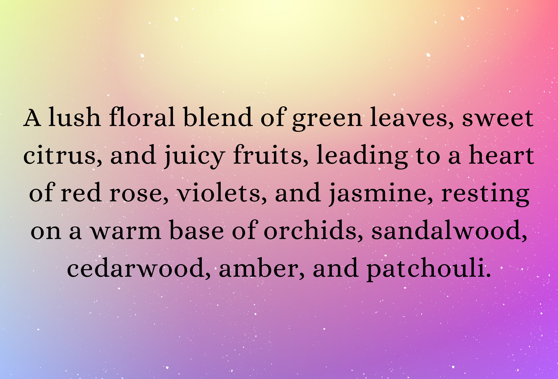 A lush floral blend of green leaves, sweet citrus, and juicy fruits, leading to a heart of red rose, violets, and jasmine, resting on a warm base of orchids, sandalwood, cedarwood, amber, and patchouli.